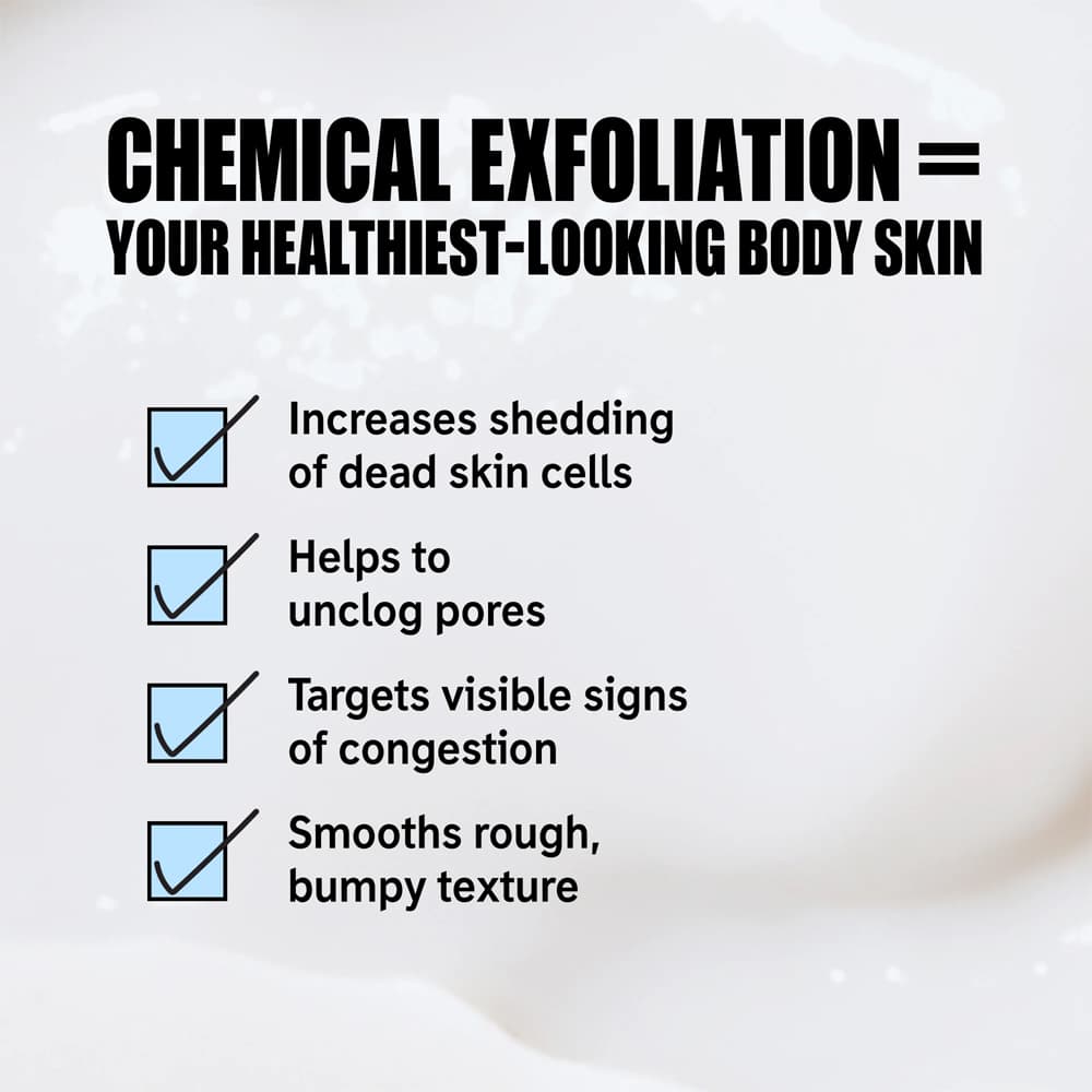 The powerful formula combines familiar skincare actives including 7% Glycolic Acid to exfoliate surface dead skin cells and help smooth rough, bumpy texture together with Salicylic Acid to help unclog oily pores and improve body skin that’s prone to breakouts and ingrown hairs. The addition of deeply nourishing Shea Butter helps to instantly soften, soothe, and comfort skin.